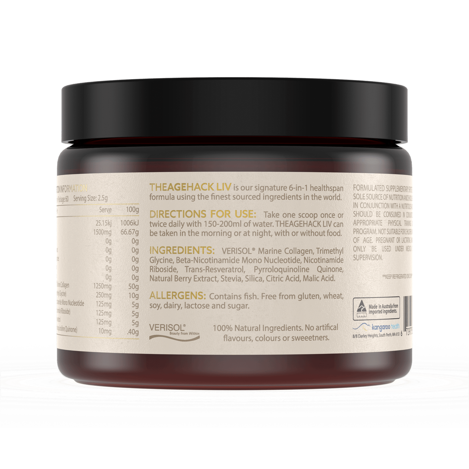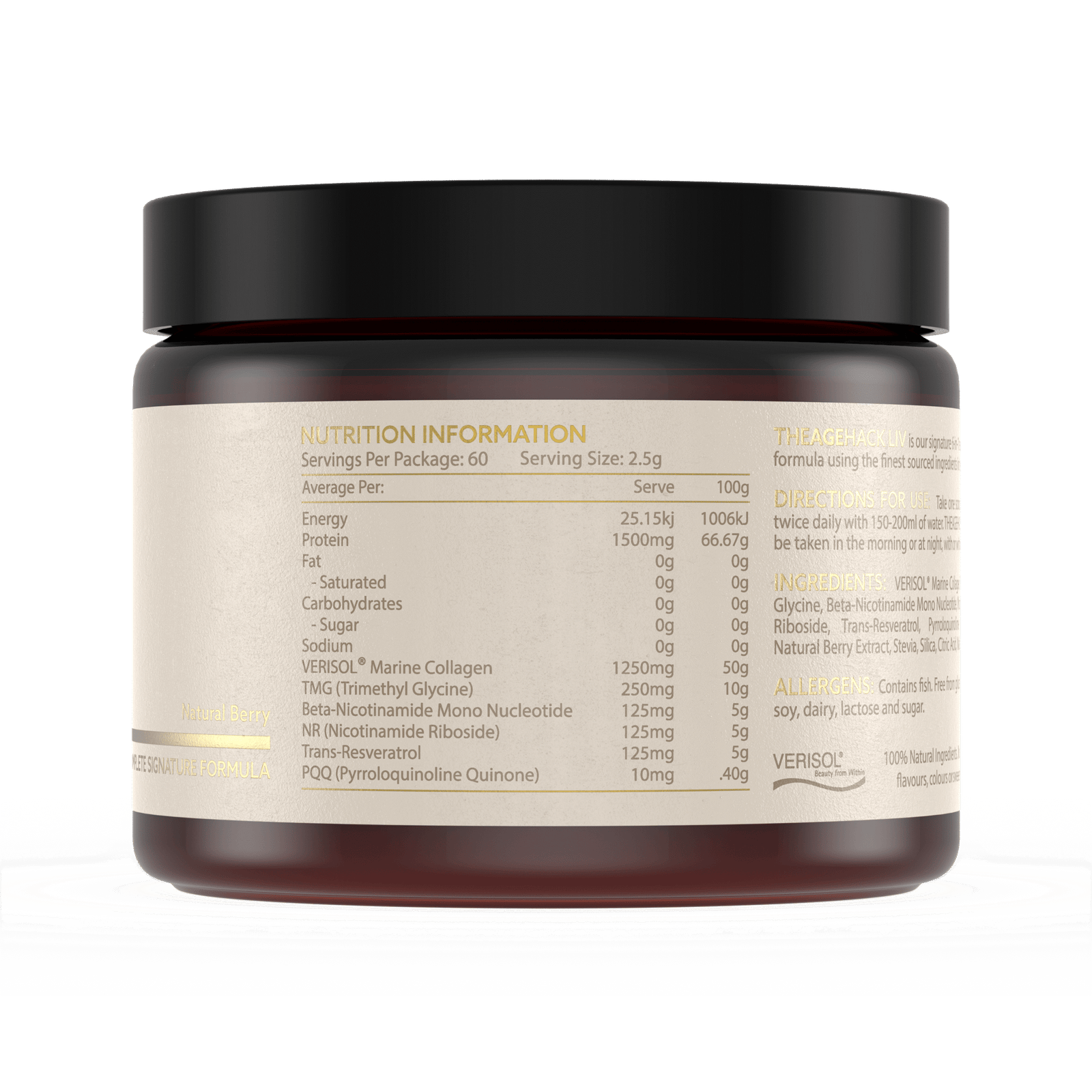 Ingredients: VERISOL Marine Collagen, Beta Nicotinamide Mononucleotide, Nicotinamide Riboside, (TMG) Betaine Anhydrous, Natural Flavours, Stevia, Anti Caking Agent (E550), Food Acids (E330, E295), Pyrroloquinoline Quinone. Trans-Resveratrol, Silica.